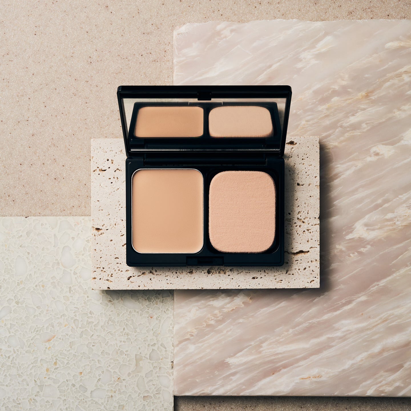 なめらかに伸び肌になじむクリーミーな固形ファンデーションと、繊細ヴェールで自然なツヤ感をアップさせるプレストパウダーのセット。ツヤ肌のうるおいと陶器のようなマット肌のいいとこ取りであるセミマットな肌をご希望の方へ。