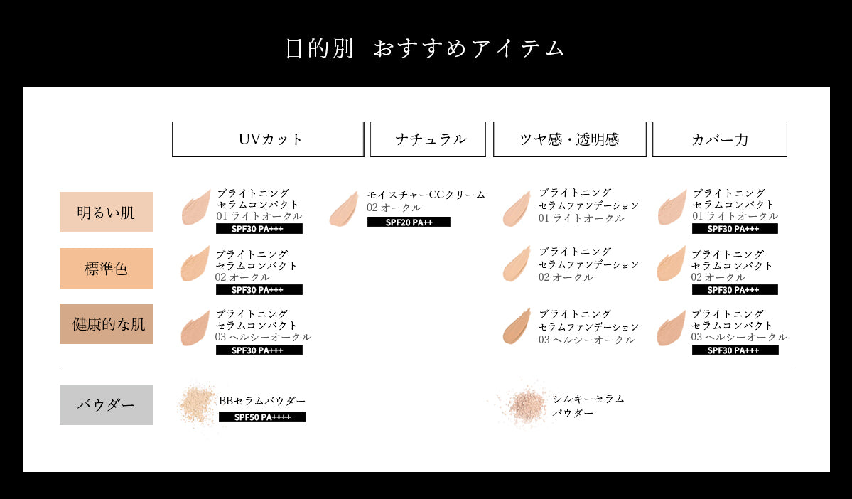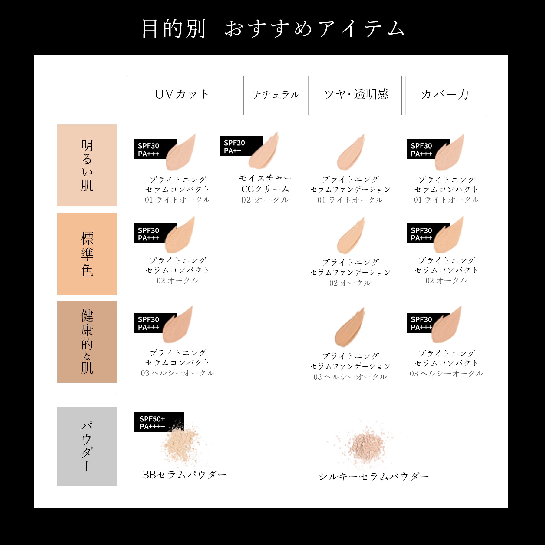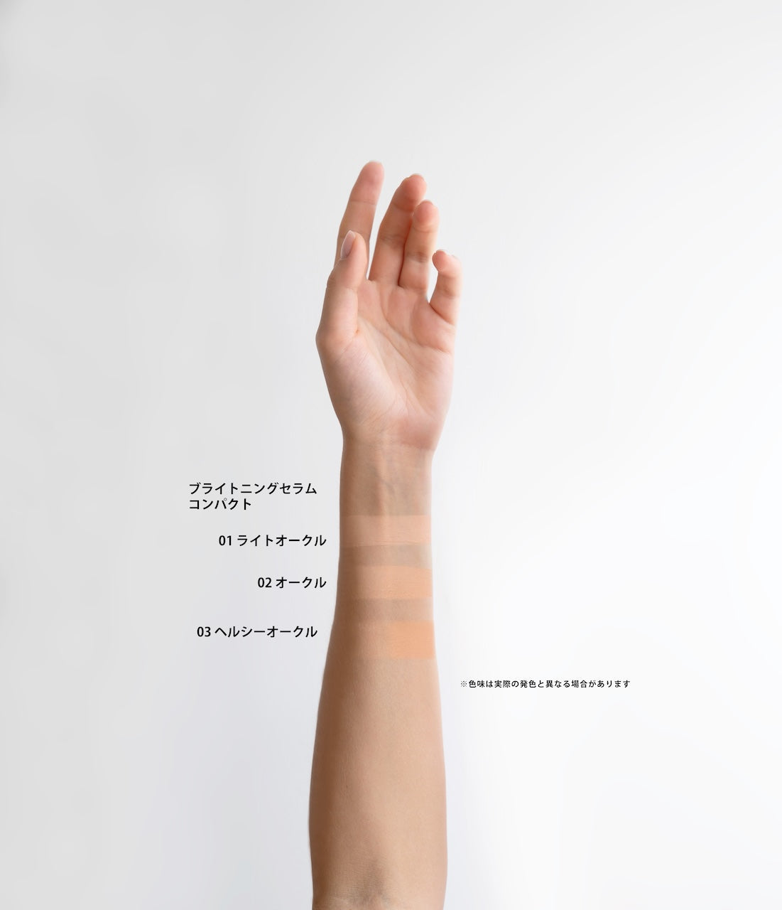 〈ブライトニングセラムコンパクト〉コメヌカ発酵液やタマヌオイルなどの美容液成分を閉じ込めた固形ファンデーション。外線吸収剤不使用でありながらSPF30 PA+++の紫外線カット効果でダメージを防止します。お色味は、ナチュラルな明るさのアイボリーカラー〈01ライトオークル〉。明るめの仕上がりをお好みの方に。